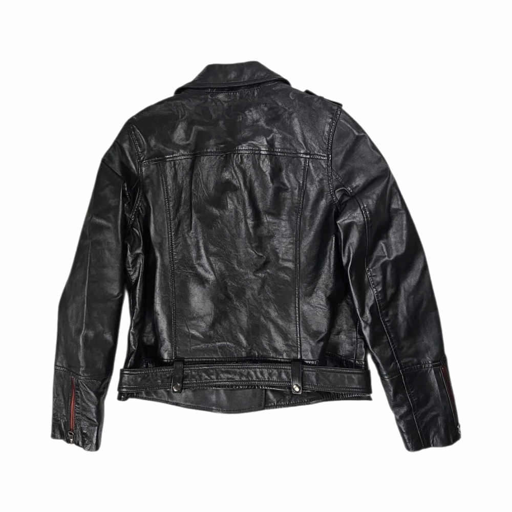 Classic biker edge meets contemporary detail in this By Very black leather jacket. Made from 100% genuine leather with a polyester lining, it features an asymmetric zip closure, bold red zip trims, tassel pullers, and a belted hem for a perfect moto-inspired silhouette. Epaulettes and multiple zip pockets add authentic biker styling, while the quality leather offers durability and timeless appeal.
