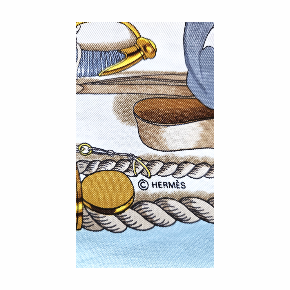 Set against a fresh pale blue border and crisp white ground, the design is a rich “cabinet of curiosities” inspired by Émile Hermès’ personal collection of maritime and travel antiques, the scarf constitutes a visual voyage through the objects that shaped the Hermès universe.