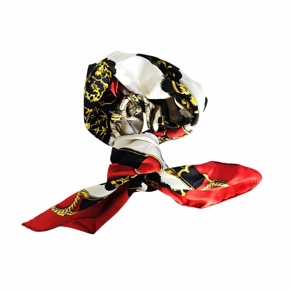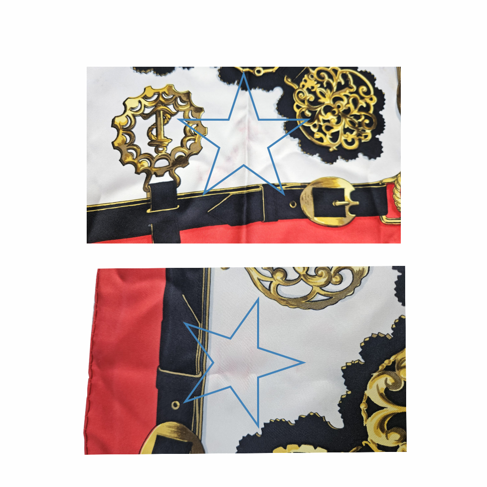 Crafted from 100% silk twill with hand-rolled edges, this scarf is in very good vintage condition. There is some light red discolouration on the white areas and a small mark, visible on close inspection but not distracting when the scarf is worn or styled – and fully reflected in the price.