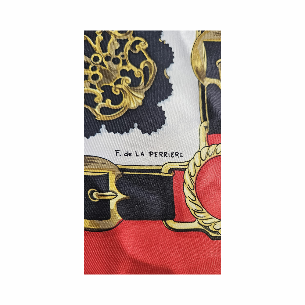 At the centre, a pair of powerfully drawn horses stand in full harness, surrounded by a circular arrangement of golden bridle rosettes, buckles and studs on a crisp ivory ground. A bold red border and black leather-strap detailing frame the design, creating a striking contrast that feels both regal and graphic – an unmistakably Hermès take on horse tack and harness hardware, echoing the house’s beginnings as a Paris harness- and saddle-maker.