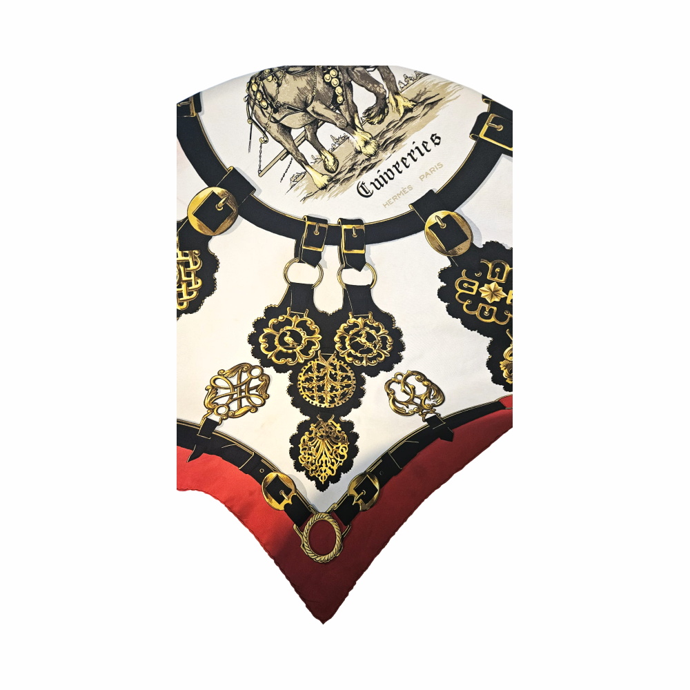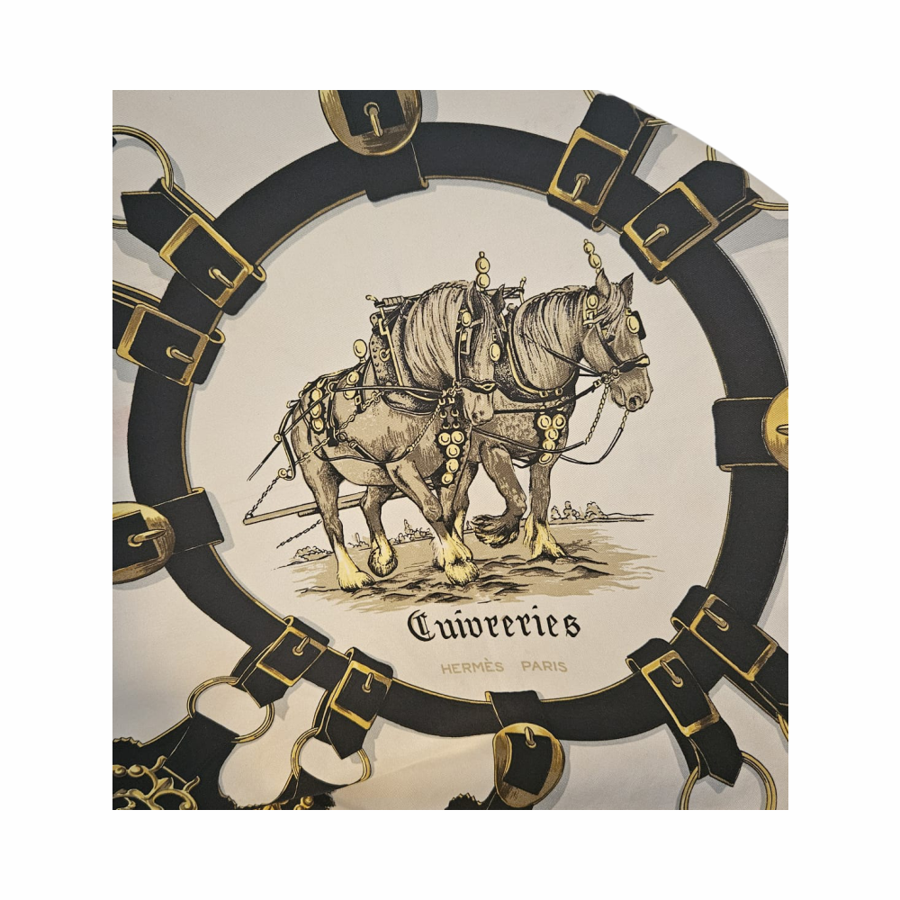 This vintage Hermès “Cuivreries” 90 cm silk scarf is a classic celebration of the Maison’s equestrian roots. Designed by Françoise de la Perrière, the carré takes its name from the ornate cuivreries – the brass harness decorations used on working and ceremonial horses.