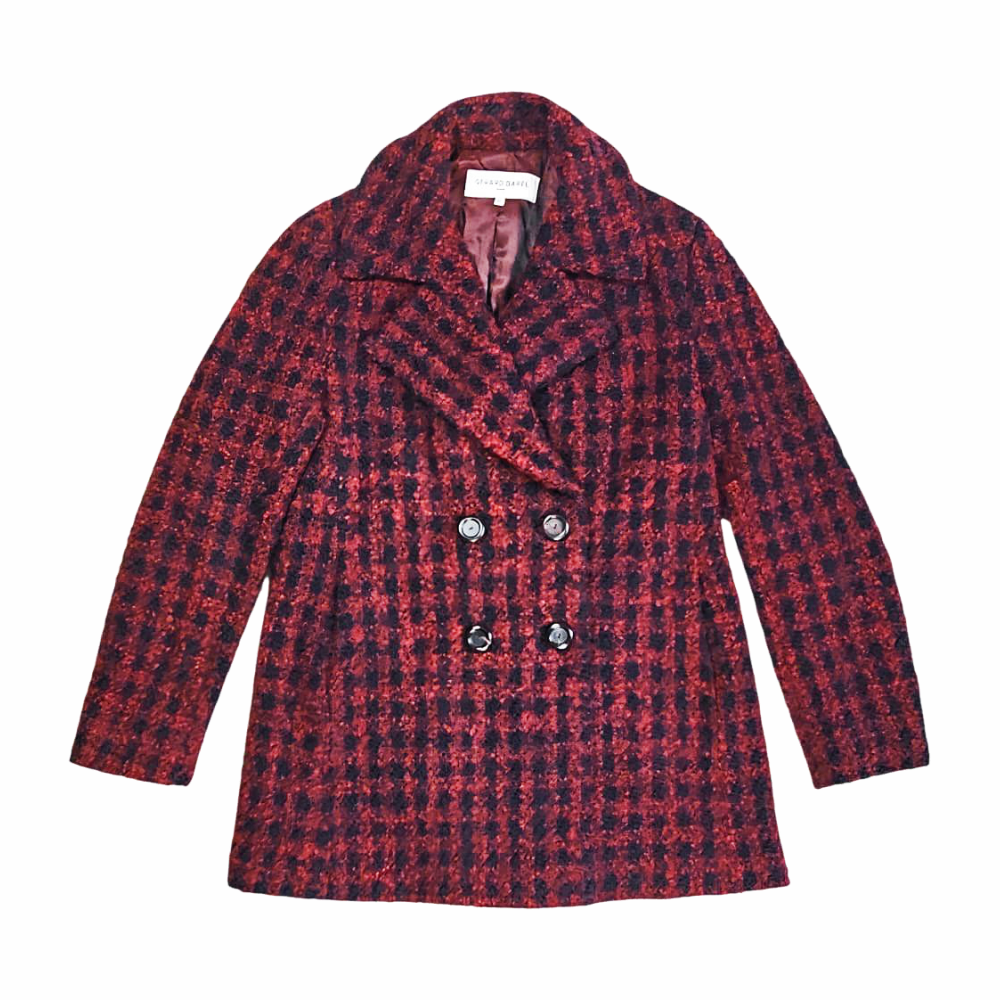 A winter statement with real Parisian polish, this Gerard Darel coat is a pea coat-inspired, double-breasted style in a richly textured bouclé weave. The fabric blends deep red with inky navy in a graphic check that reads bold yet classic—exactly the kind of piece that lifts denim and boots, but looks equally sharp over tailoring. The cut is structured through the shoulders with a wide notched collar, then skims the body in a flattering, easy-to-layer shape, finished with a neat double-breasted front and smart sleeve line.