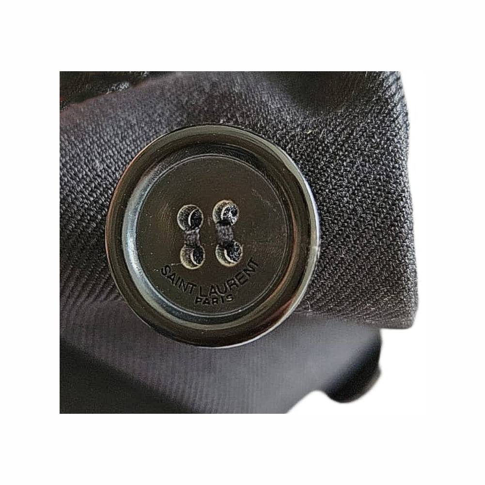 Crafted from the same premium materials as the house’s retail tailoring, this Saint Laurent Uniform two‑button blazer is cut in fine black wool gabardine with a smooth silk lining for a refined drape and all‑day comfort. Designed originally as staff uniform, it follows the same pattern standards and fabrication as the ready‑to‑wear suiting, making it an understated, impeccably made jacket for everyday polish. The silhouette is clean and structured with notched lapels, a chest welt pocket and flap pockets, finished with branded buttons and neat buttonholes. Inside, the full silk lining and practical internal pocket speak to classic Saint Laurent construction, while the back remains crisply tailored for a sharp profile. Pair it with trousers or denim for a timeless, Parisian look that transitions effortlessly from work to evening..