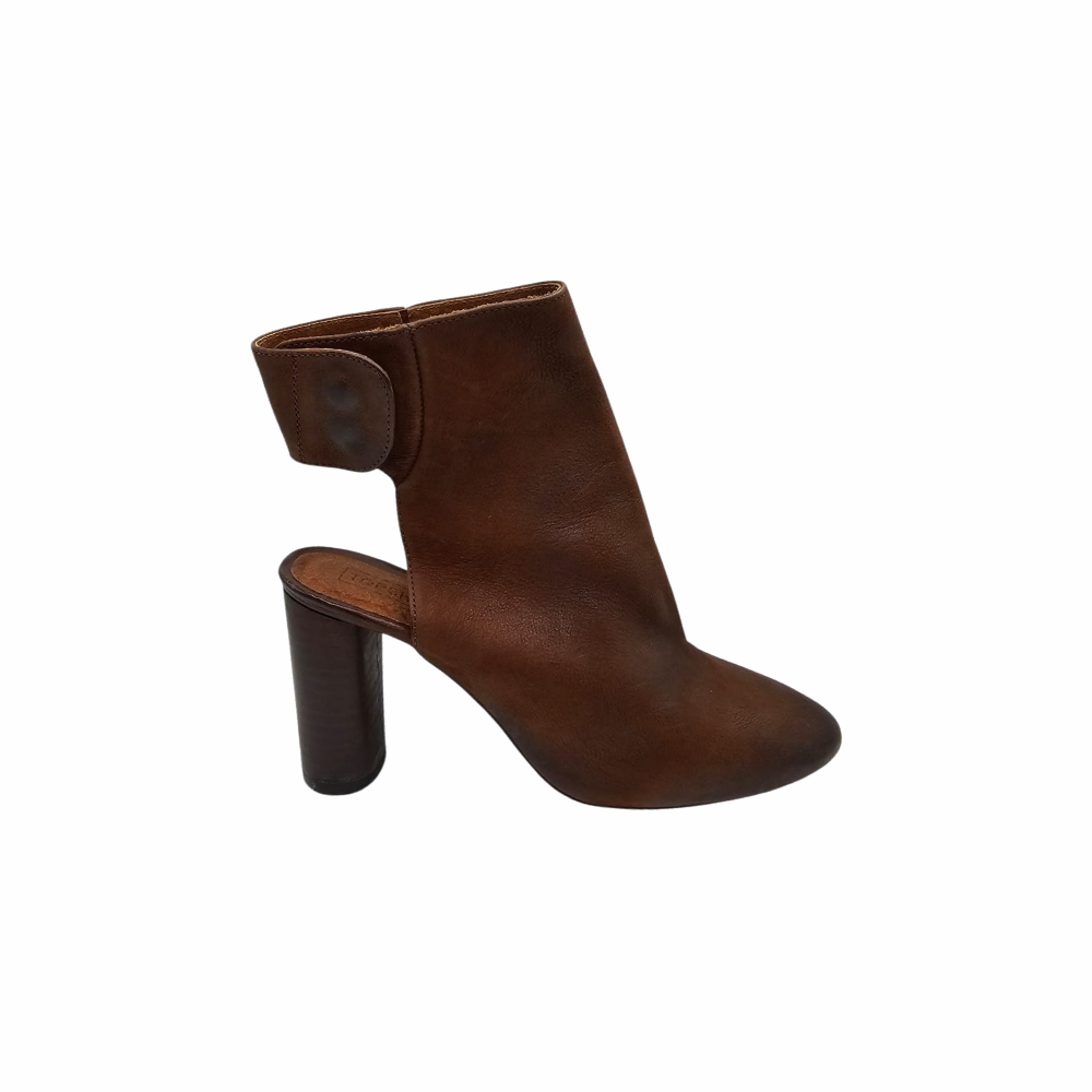 The Topshop Open Heel Ankle Boots available are a distinctive blend of edgy design and contemporary fashion. Crafted in sleek black faux leather, these boots feature an almond toe and a mid-height block heel that offers both style and comfort. What sets them apart is the open heel design, adding a modern twist to the classic ankle boot silhouette. A side snap closure ensures easy wear, making them a versatile addition to any wardrobe. Whether paired with cropped jeans or a flowing dress, these boots are designed to make a statement